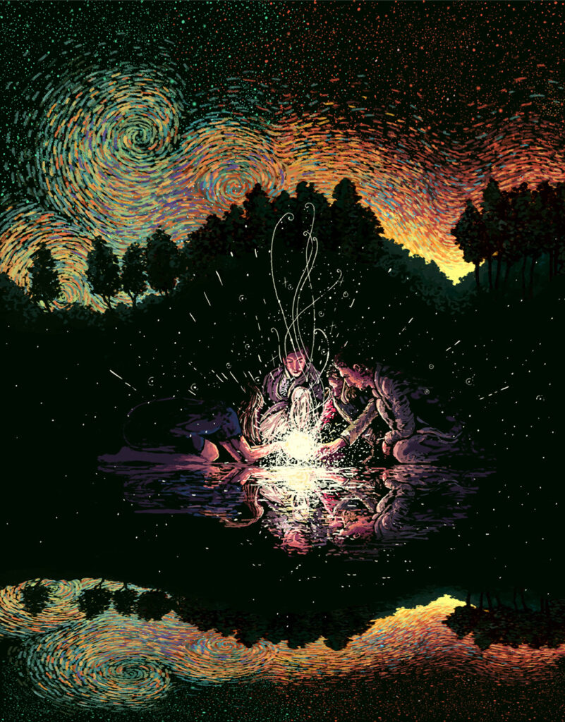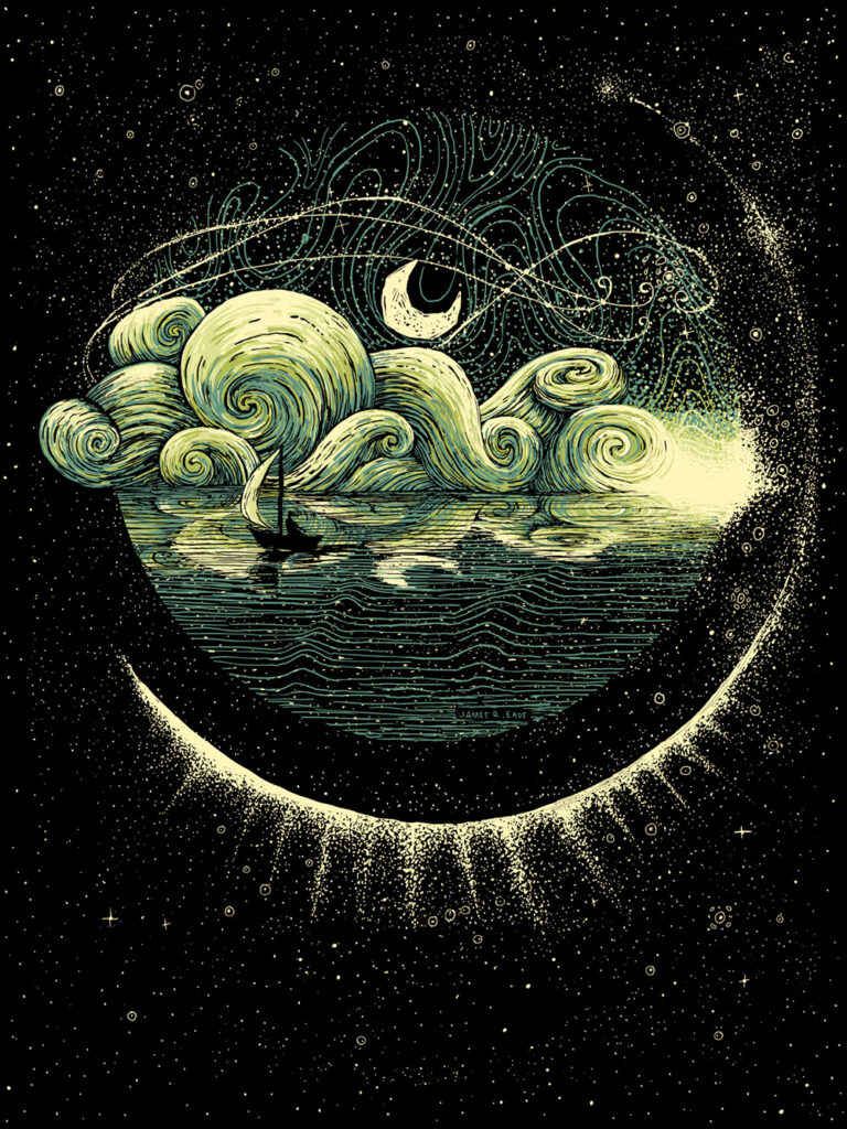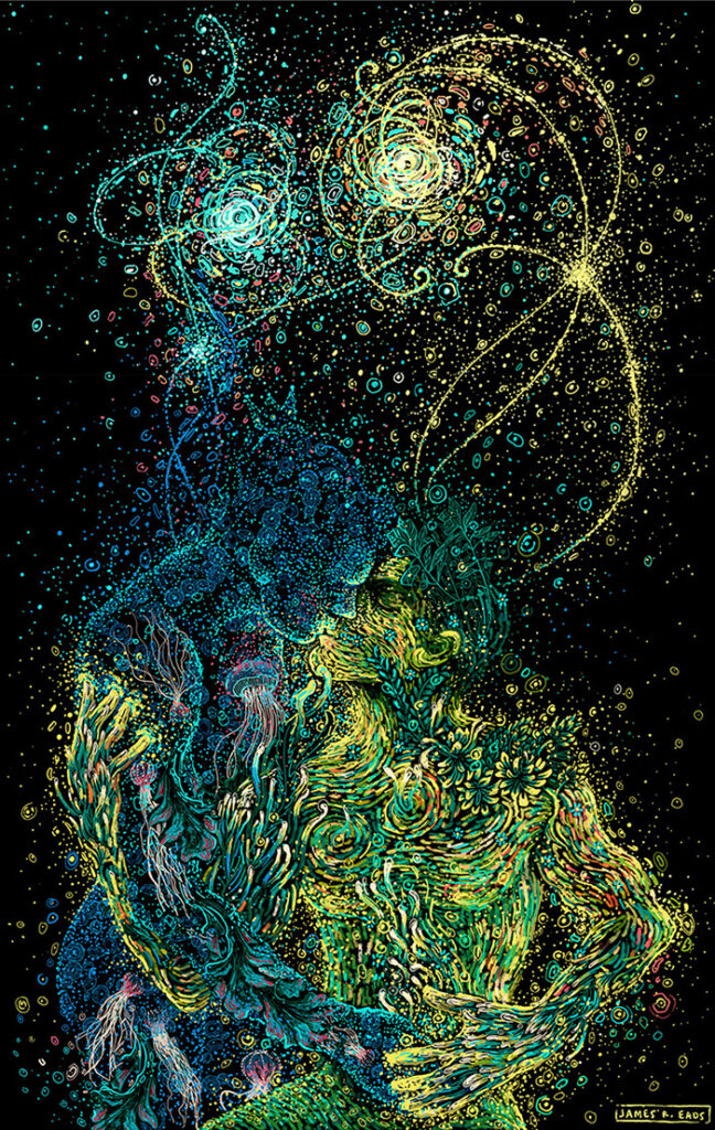 James nos conglomera expresión gestual con estilo de puntillismo, haciendo alegoría cósmica con narrativa en sinergia.